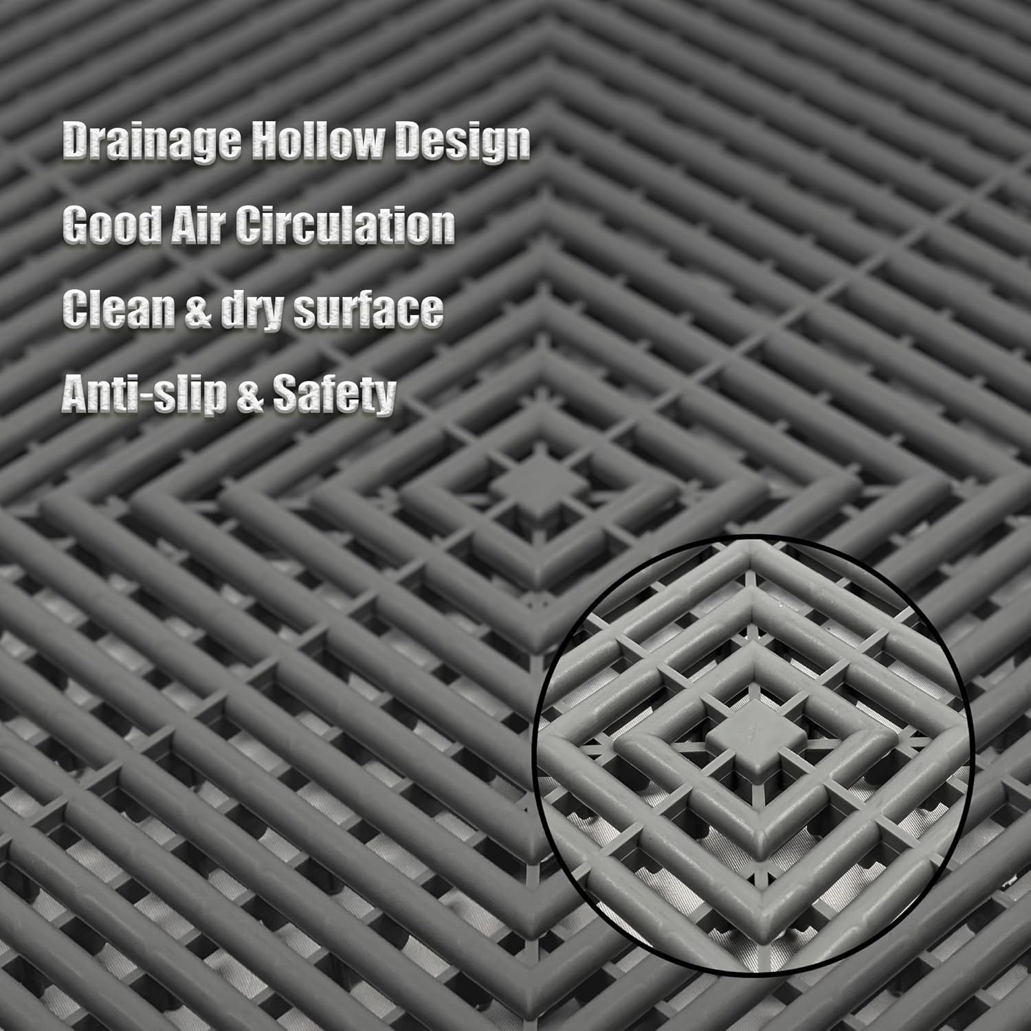 - Superior Drainage & Easy Cleaning:Drainable garage floor tiles,open grid design rapidly drains water, sand, and debris while allowing ventilation for a cleaner, drier surface;simply hose down the drainage floor tiles for maintenance