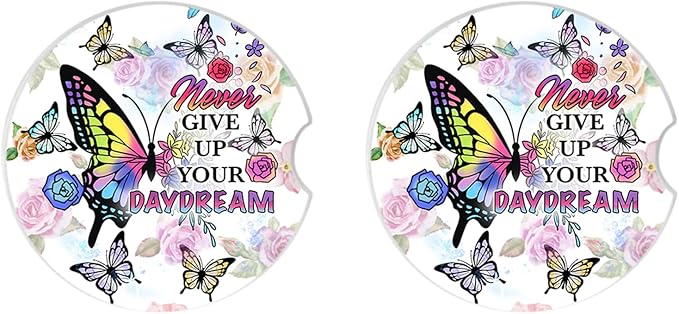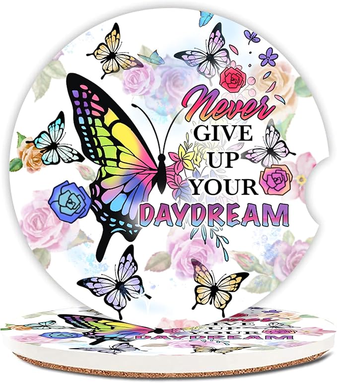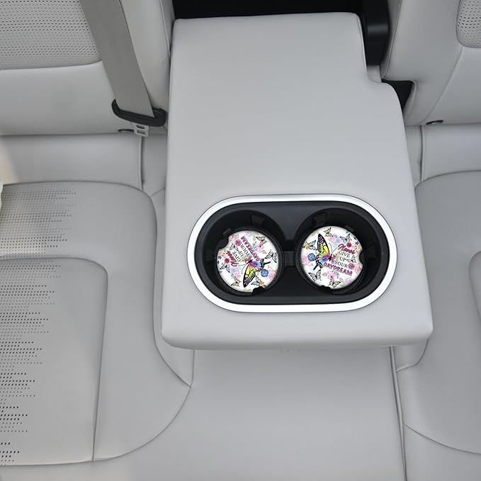 Car Coasters 2 Pack, Small 2.56" Ceramic Stone & Non-Scratch Cork Base Car Cupholder Absorbent Coaster Set for Women/Men Drink Cup Holder Coasters (Butterfl)