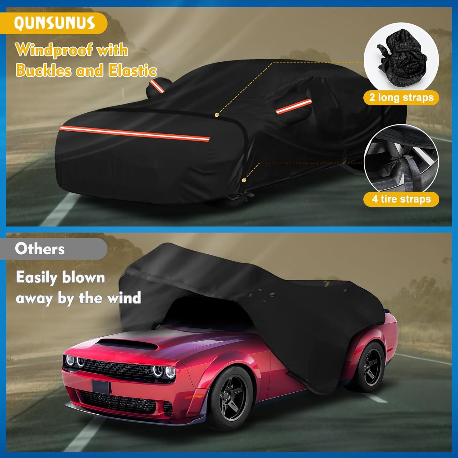 - 【Windproof Upgrade】1.There are four tire straps to keep the car rain cover secured in place.2. Buckle the windproof buckle that goes through the bottom of the car.3. Elastic hems on the front and back end for a better fit on your car.4. Two complimentary extra-long windproof straps can be strapped to your car's hood and rear.