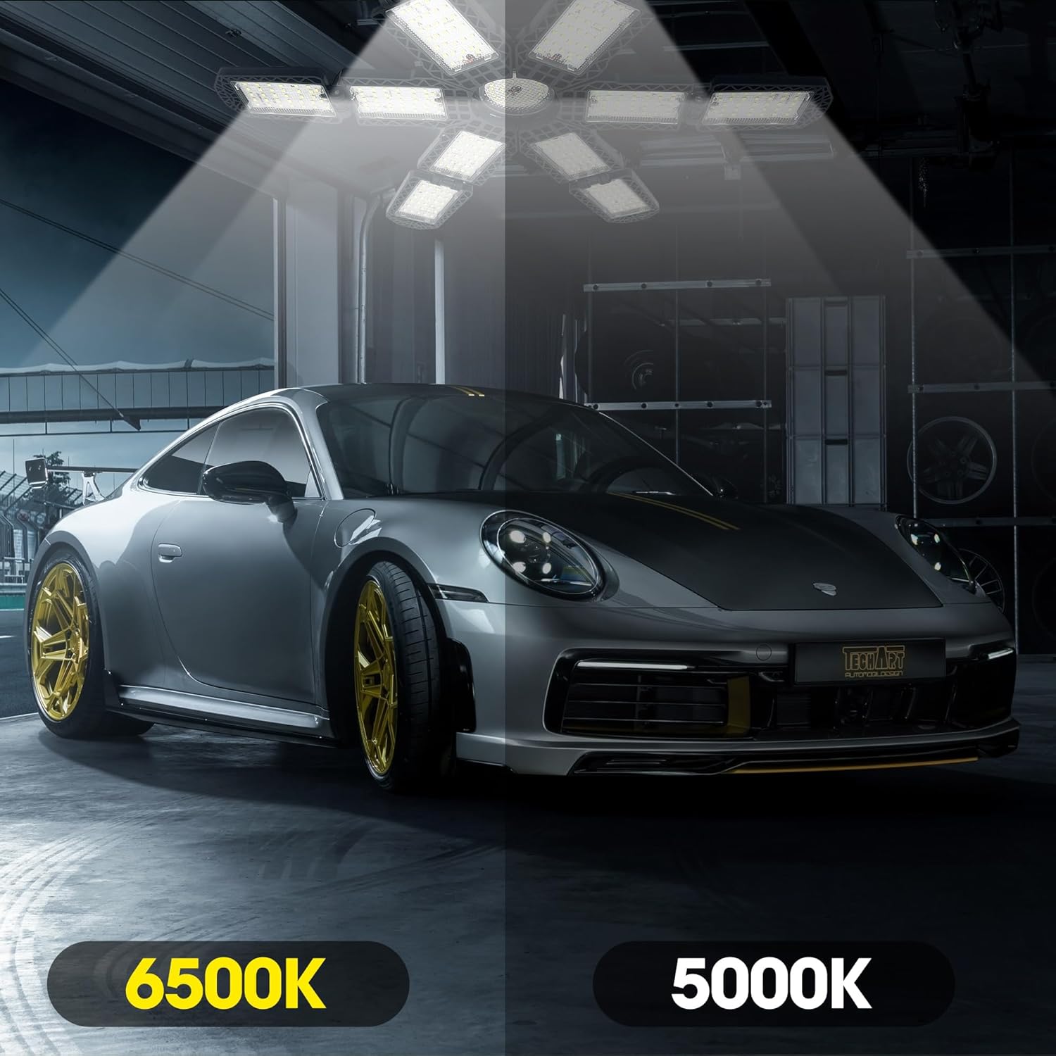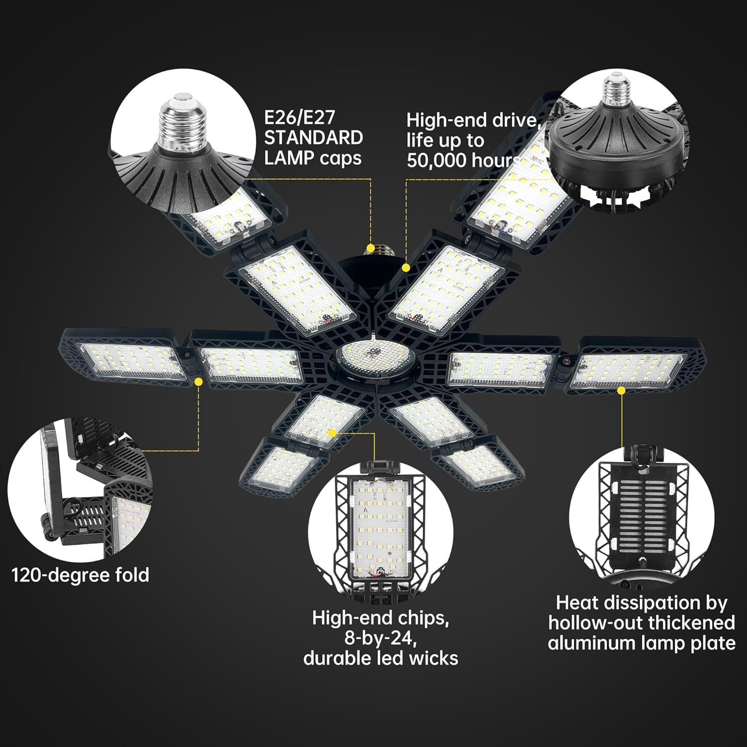 - 【12+1 Deformable Super Bright LED Garage Lights】- With 12+1 ultra-bright adjustable LED pannels. It features with 13*24 PCS top quality diodes that total 30000 lumens, CRI80+, 6500K daylight can give you 85% energy saving for your garage. The upgraded lighting fixtures have sufficient brightness and are the preferred choice for work.