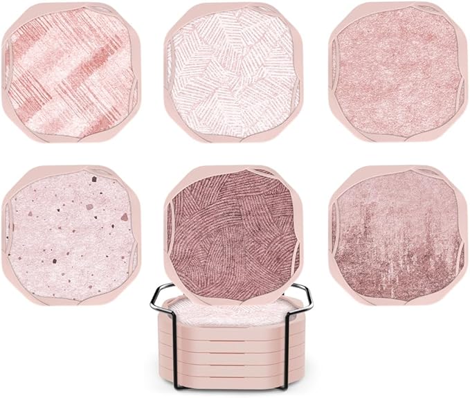 UMIRRO Pink Coasters for Drinks with Holder, Absorbent Felt Coasters with Silicone Case for Wooden Coffee Table, 4", Set of 6