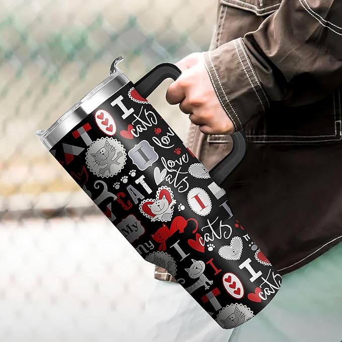40 Oz Cat Tumbler With Straw and Handle, Double Wall Stainless Steel Coffee Mug, Insulated for Cat Lovers, Mom or Dad Cups Gifts for Women