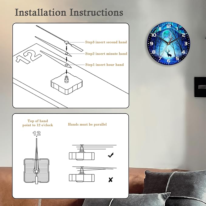 - 【Decorative Wall Clock】Forest Deer Moon Prints Are Bright And Colorfast, Metal Hands, Colorful And Easy To Read,Back Slot Design Is Easy To Install, Comes With 1 Hook, Also Comes With a Stand, You Can Put The Wall Clock On The Table For Easy Viewing.