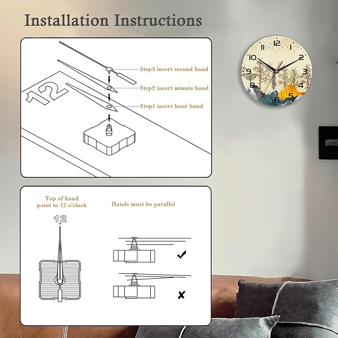 - 【Decorative Wall Clock】Golden Forest Mountain Prints Are Bright And Colorfast, Metal Hands, Colorful And Easy To Read,Back Slot Design Is Easy To Install, Comes With 1 Hook, Also Comes With a Stand, You Can Put The Wall Clock On The Table For Easy Viewing.