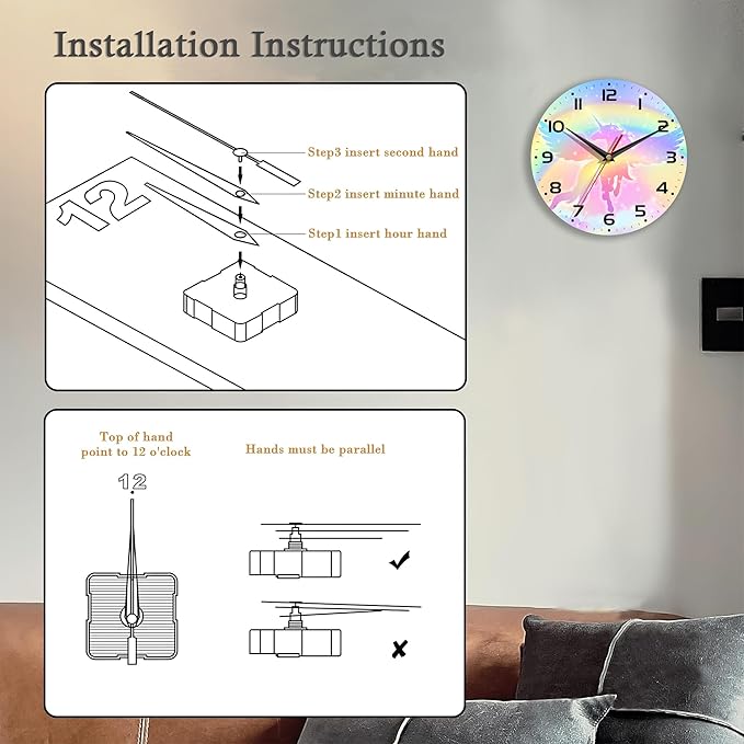 - 【Decorative Wall Clock】Rainbow Unicorn Prints Are Bright And Colorfast, Metal Hands, Colorful And Easy To Read,Back Slot Design Is Easy To Install, Comes With 1 Hook, Also Comes With a Stand, You Can Put The Wall Clock On The Table For Easy Viewing.