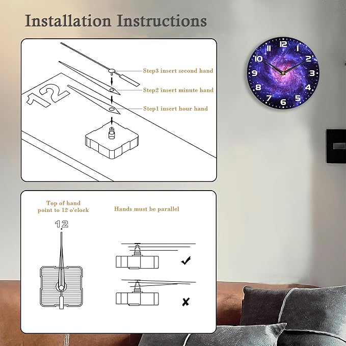 - 【Decorative Wall Clock】Cosmic Galaxy Prints Are Bright And Colorfast, Metal Hands, Colorful And Easy To Read,Back Slot Design Is Easy To Install, Comes With 1 Hook, Also Comes With a Stand, You Can Put The Wall Clock On The Table For Easy Viewing.