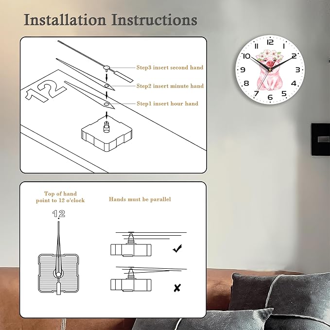 - 【Decorative Wall Clock】Cute Pig Flower Prints Are Bright And Colorfast, Metal Hands, Colorful And Easy To Read,Back Slot Design Is Easy To Install, Comes With 1 Hook, Also Comes With a Stand, You Can Put The Wall Clock On The Table For Easy Viewing.