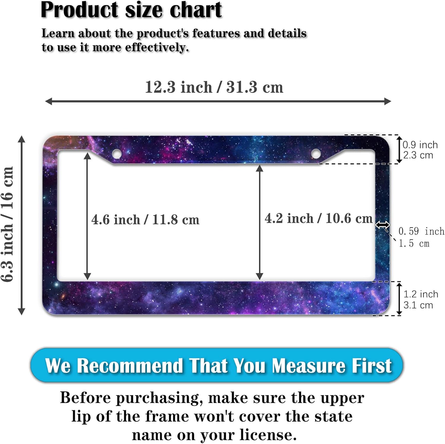 - STANDARD FRAME SIZE: Ensure a perfect fit by checking the dimensions to avoid covering your state name. These frames are specifically designed to fit standard American license plates measuring approximately 12.3" x 6.3" (16 x 31 cm). for most license plates in the U.S.