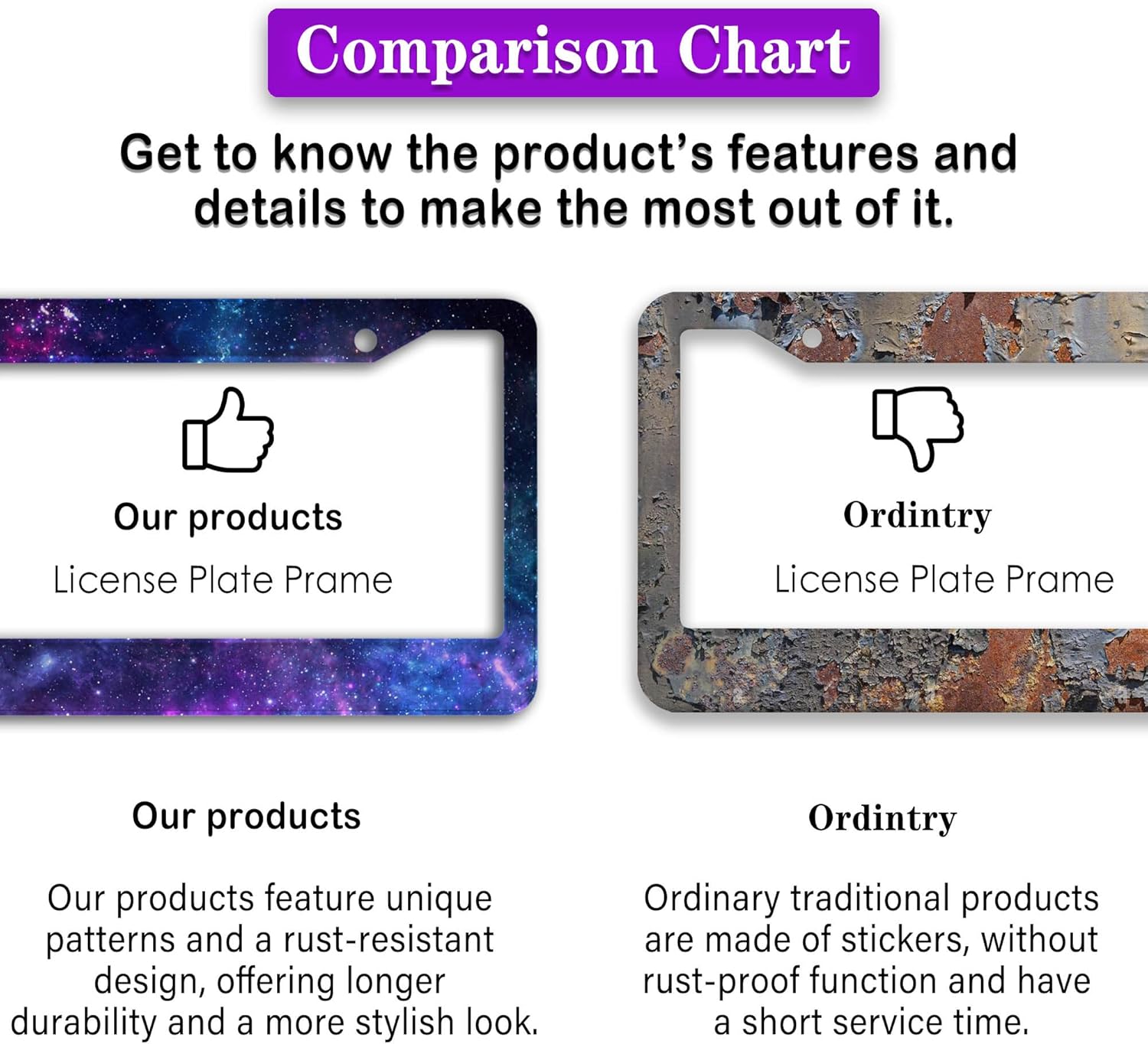 - ALUMINUM FRAME: This License Plate Frame is crafted from high-quality aluminum that is resistant to corrosion, rust, and harsh weather conditions. Its rugged reliability design ensures a long lifespan, making it capable of withstanding car washes and extreme weather, providing you with a reliable and stylish solution for your vehicle.