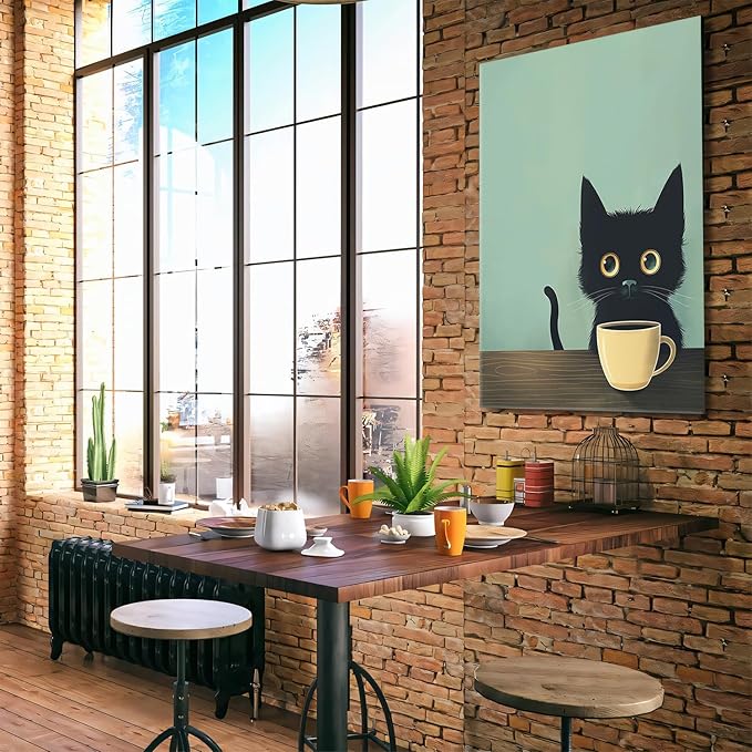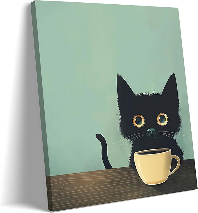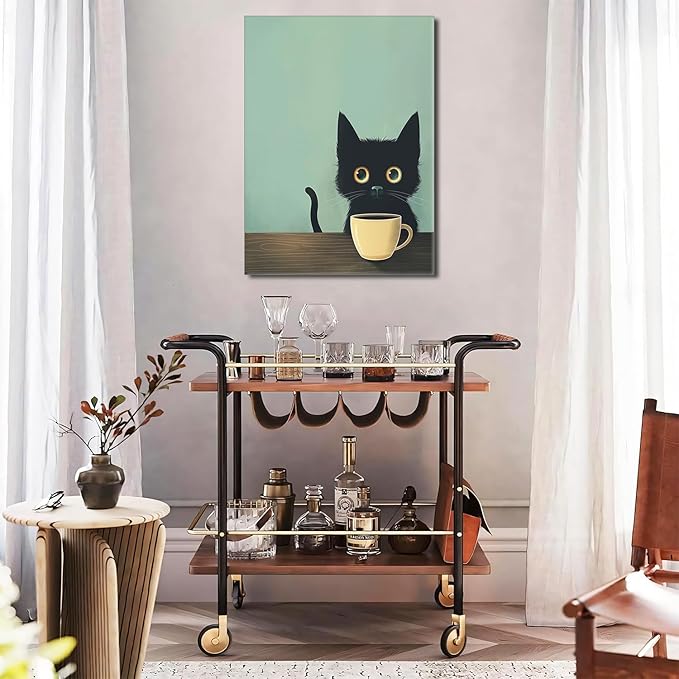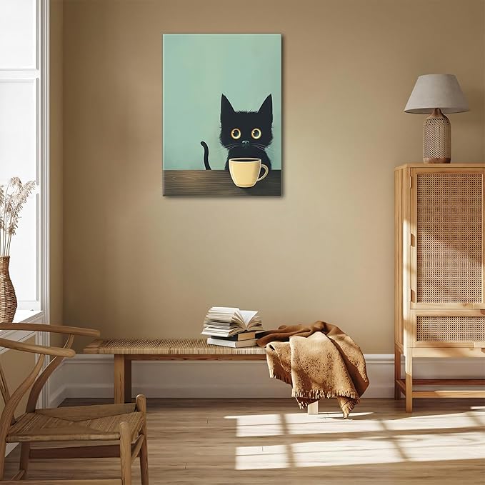 - 【Charming Black Cat Wall Art】: This framed abstract wall art features an adorable black cat enjoying a cup of coffee, bringing a whimsical and cozy vibe to any space. Perfect for cat lovers and those who appreciate cute, retro-inspired decor.