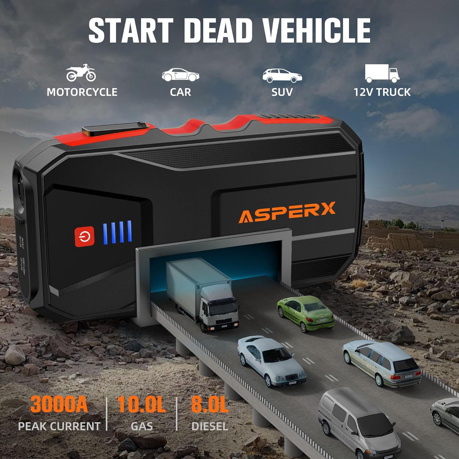 - 【3000A Jump Starter】 The ASPERX 3000A car battery jump starter can effortlessly jump-start 10L gas or 8.0L diesel engines in mere seconds. When the battery has sufficient charge, the car jump starter can quickly provide enough cranking amperage to the car battery, ensuring that the vehicle starts up within a short period of time.Even if your battery's voltage dips too low (below 9V), simply pressing the "BOOST" button will get your engine running again. Widely supports various car models.