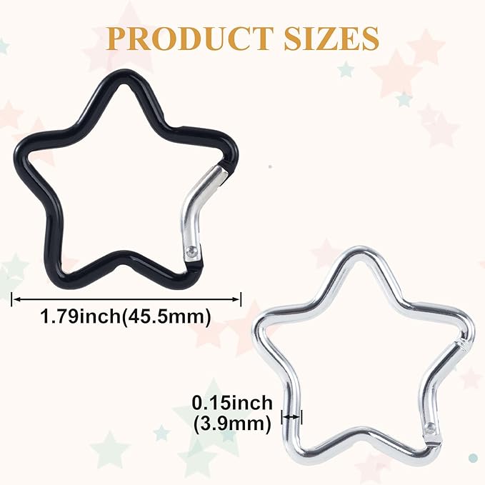 - Package Contains: You will receive 4 pcs zinc alloy star shaped carabiner in total. The diameter is 1.79 in (4.55 cm), the thickness is 0.15 inch (3.9 mm). It contains 2 colors: black and silver, a variety of styles for your daily use