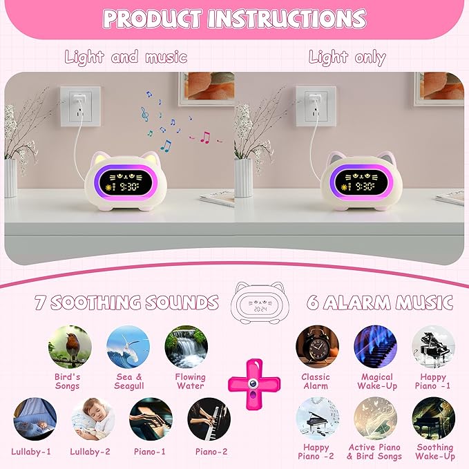 - Kids Clock with Sleep Sound: Offering 7 soothing sleep music options and 6 gentle alarm sounds to choose from, this alarm clock provides a peaceful and enjoyable waking experience for your little ones. The intuitive design of this alarm clock encourages independence and self-sufficiency in managing their sleep routines. Help your child wake up refreshed and start the day with enthusiasm. Promote healthy sleep habits and ensure a smooth morning routine with the sleep trainer clock