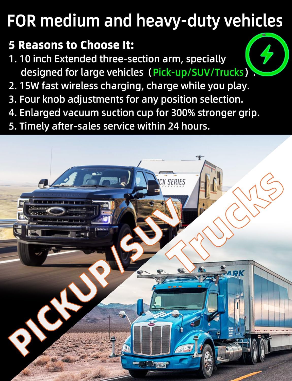 Wireless car Charger Phone Holder Mount for Truck,【10-inch Long arm 】 Pickup Truck Phone Holder Qi2 15W Fast Charging Heavy Duty Truck and Large SUV Windshield/Dashboard,for iPhone Samsung LG