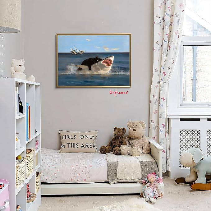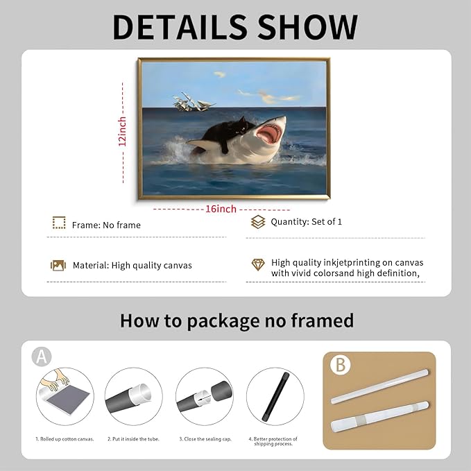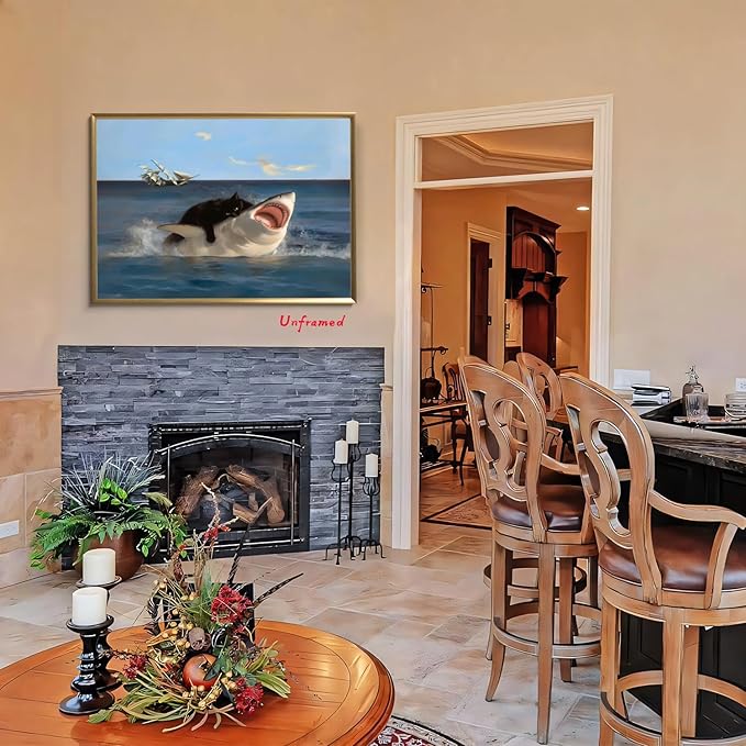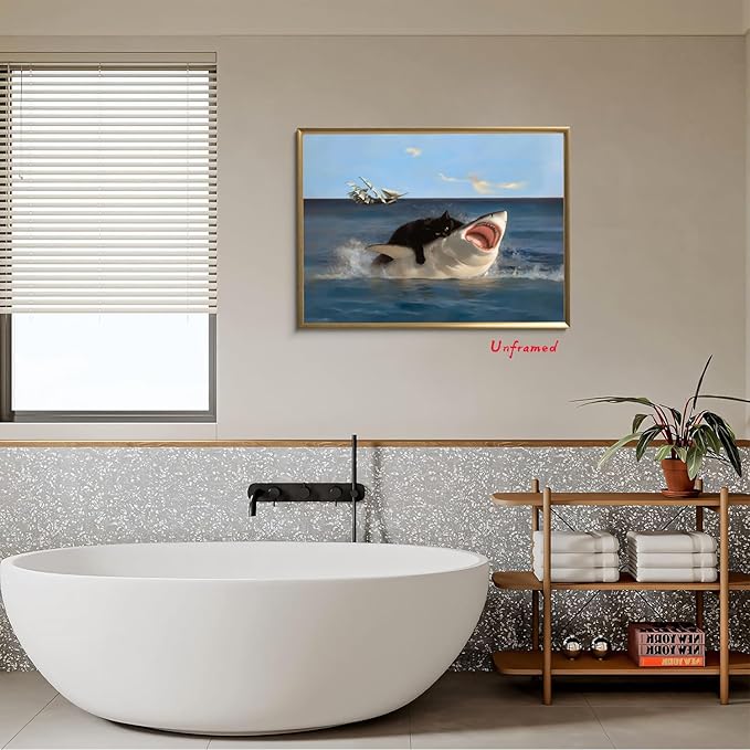 - 【Versatile Room Decor】:These cat and shark canvas prints are perfect for a variety of spaces, including bedrooms, living rooms, bathrooms, and any other room that could use a fun and quirky touch. The 12x16 inch size makes them easy to incorporate into any decor scheme, whether displayed individually or as a set. These cat wall art and shark wall art pieces will enhance the aesthetic of any room.