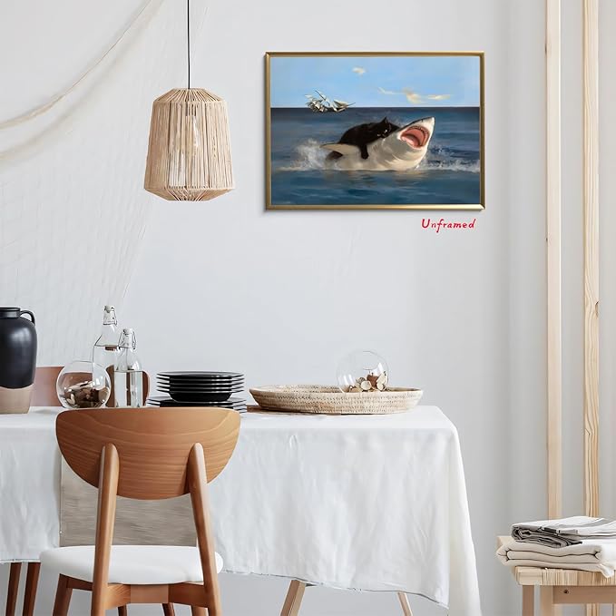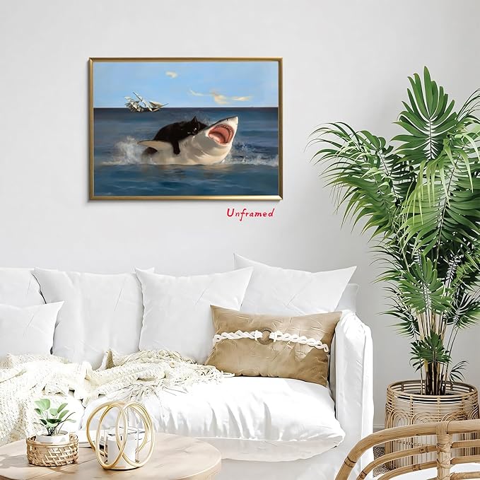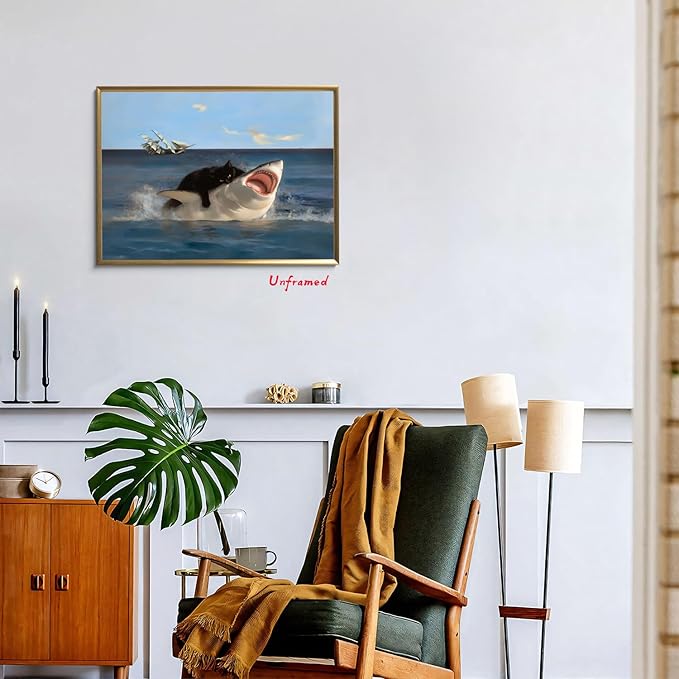 - 【High-Quality Canvas Prints】:Our black cat and shark artworks are printed on high-quality canvas, ensuring lasting durability and vibrant color reproduction. The high-definition printing process captures every humorous detail and abstract design, bringing these funny cat posters and shark posters to life. The excellent color and detail make these prints stand out as high-quality cat painting and shark poster art.
