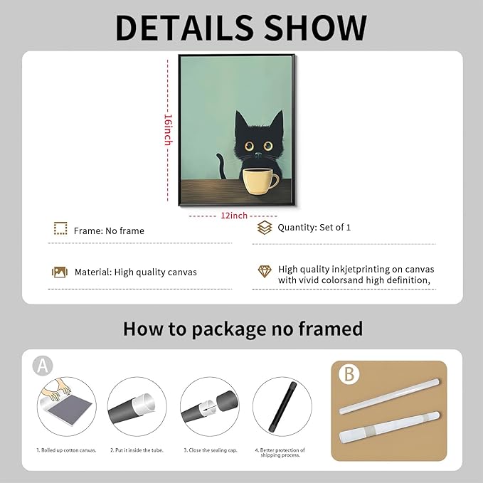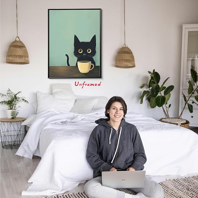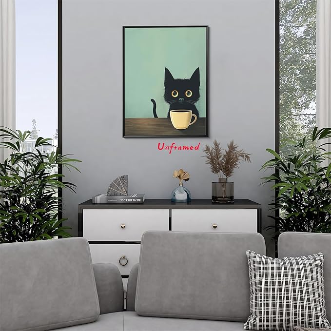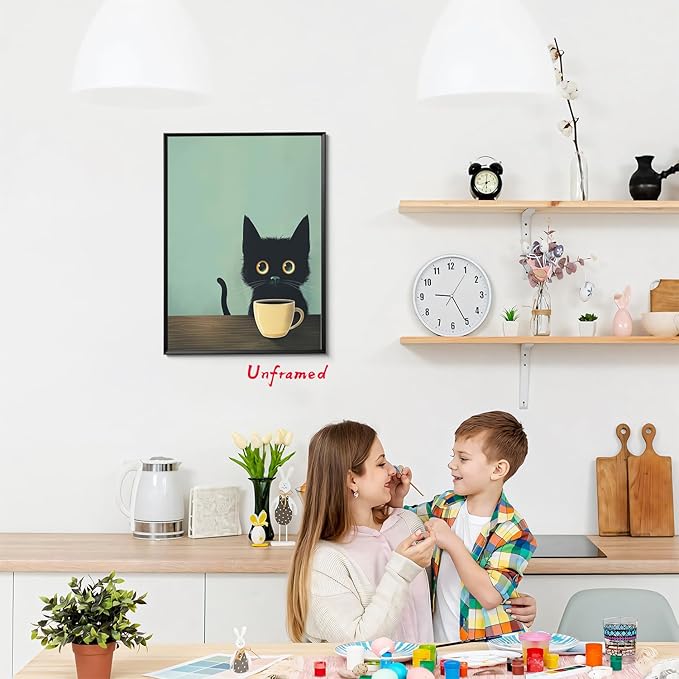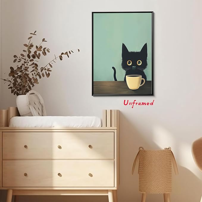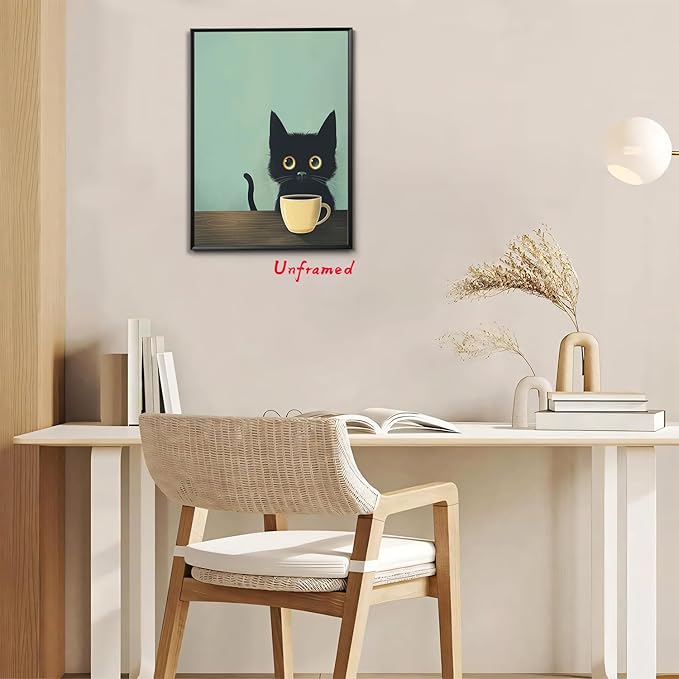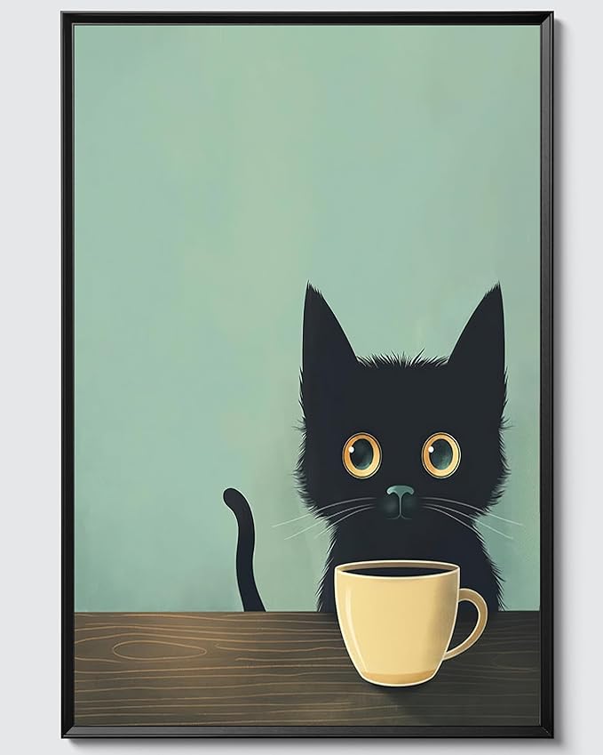 - 【Charming Black Cat Wall Art】: This framed abstract wall art features an adorable black cat enjoying a cup of coffee, bringing a whimsical and cozy vibe to any space. Perfect for cat lovers and those who appreciate cute, retro-inspired decor.
