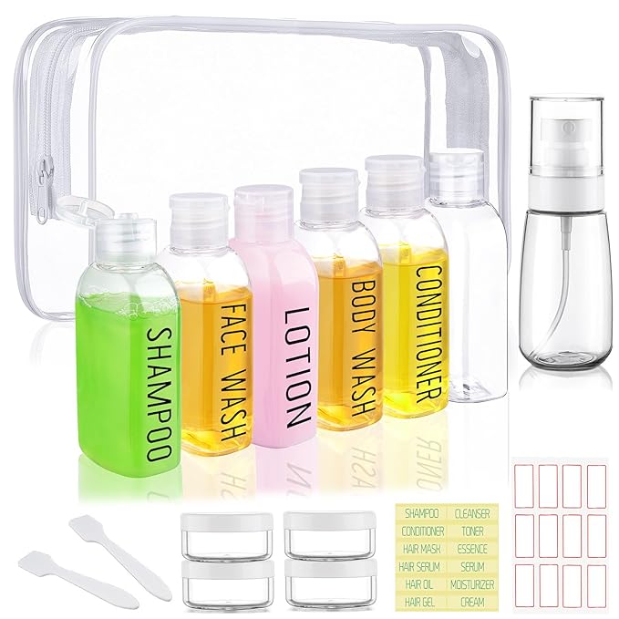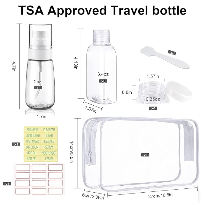 - Comprehensive Travel Accessories Set: Elevate your travel experience with our all-inclusive travel size toiletries kit. This set features 6 premium travel bottles (3.4 oz), 1 fine mist spray bottle (2 oz), 4 small cream jars (0.35 oz), 2 labels, and 2 spatulas, all stored in a waterproof white bag. Each travel bottle pre-printed "SHAMPOO," "CONDITIONER," "BODY WASH," "LOTION," and "FACE WASH," plus an extra blank bottle for customized needs.