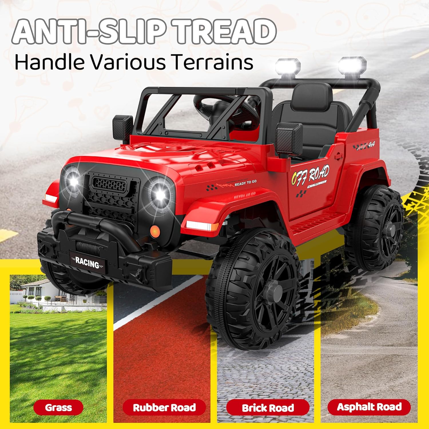 - All For Kids' Safety: When the kids electric vehicle starts up, the soft start system will operate to avert bumps caused by sudden acceleration or braking. It is equipped with a 13" wide seat featuring an adjustable safety belt and lockable doors, providing enhanced protection for your child. An override brake function on the remote adds an additional layer of safety. A max of 3.1 mph safe speed for smooth rides on outdoor adventures