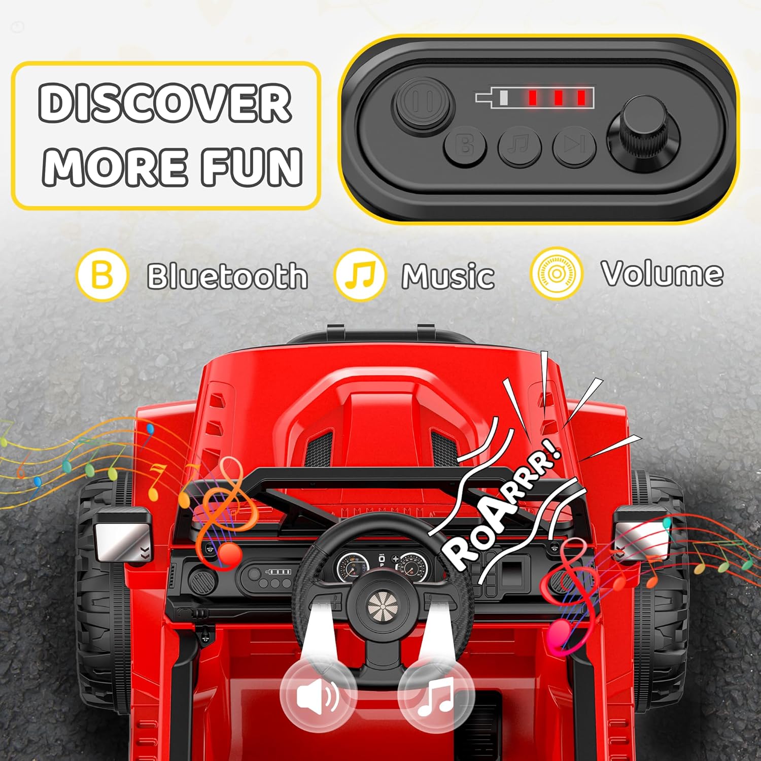 - Fun & Easy to Operate: This kids ride on truck car is equipped with MP3 player that supports wireless connection to your phone. Except for the pre-programed songs, you can also play your little ones’ favorite music while cruising. Unlike those traditional music panels, this one has big buttons that are super user-friendly for little hands to operate, rotary knob for volume adjustment, and easy-to-read battery level bar from the screen