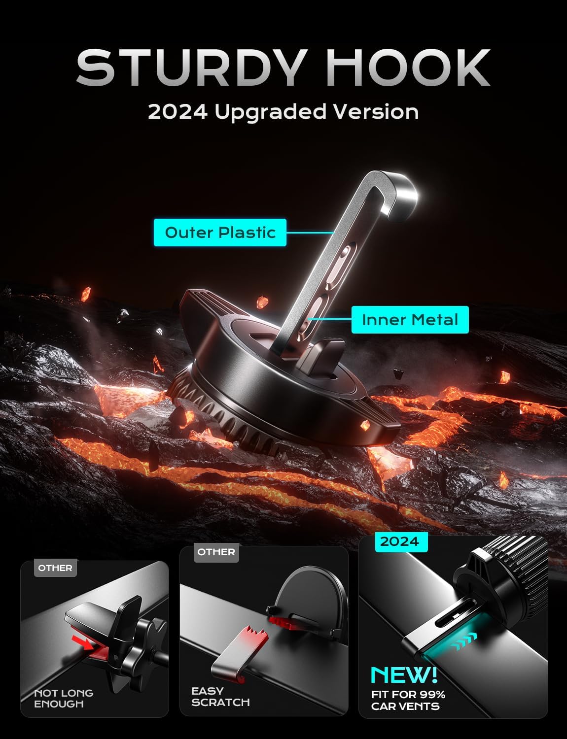 - WIDELY APPLICABLE VENT MOUNT: The charging phone mount for car is equipped with the latest upgraded metal hooks, compatible with 99% round, vertical, and horizontal air vents. The length of the hook is fixed by a gear locking mechanism, ensuring a stable grip on one of the car's air vent blades, preventing it from loosening or falling off on bumpy roads. Fit car vent blades with a width of less than 1.42 inches (3.6 cm).