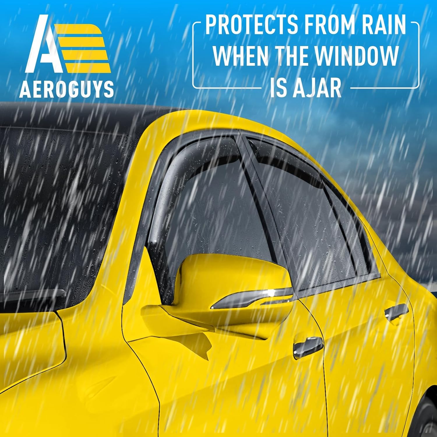 - No Tools Needed, Quick and Easy Assembly – These rain guards are very easy to fit. IN-CHANNEL INSTALLATION provides perfect fit for your car. Just slip it onto your car’s window and your job is done within minutes. There is no drilling or no tools required. Be sure that AEROGUYS window deflectors are water resistant, sun protective and will not bend, break or crack regardless of the weather conditions.