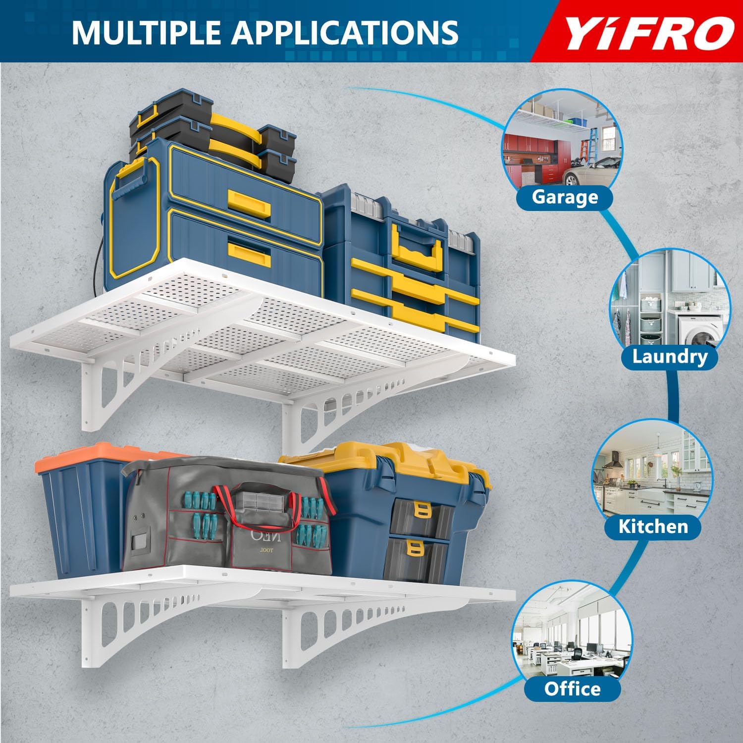 - HEAVY DUTY CONSTRUCTION: YIFRO garage wall shelving takes its cues from architectural frame construction, with a 2x3 ft individual bracket load capacity of 250 lbs. and a total of 500 lbs. for 2 shelves, which makes it easy to store most of the items in your garage.