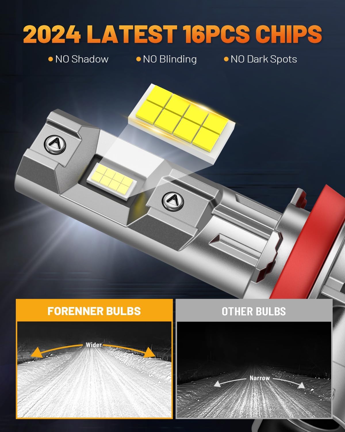 - 【Night & Day Difference in Visibility】FORENNER H11 9005 bulbs adopt newest highly bright Top-Automotive chips in each bulb which provides a total of 96000LM light output per set to offer you better visibility. Prosee the wild animals, falling rocks, or other obstacles in advance to ensure safer driving.