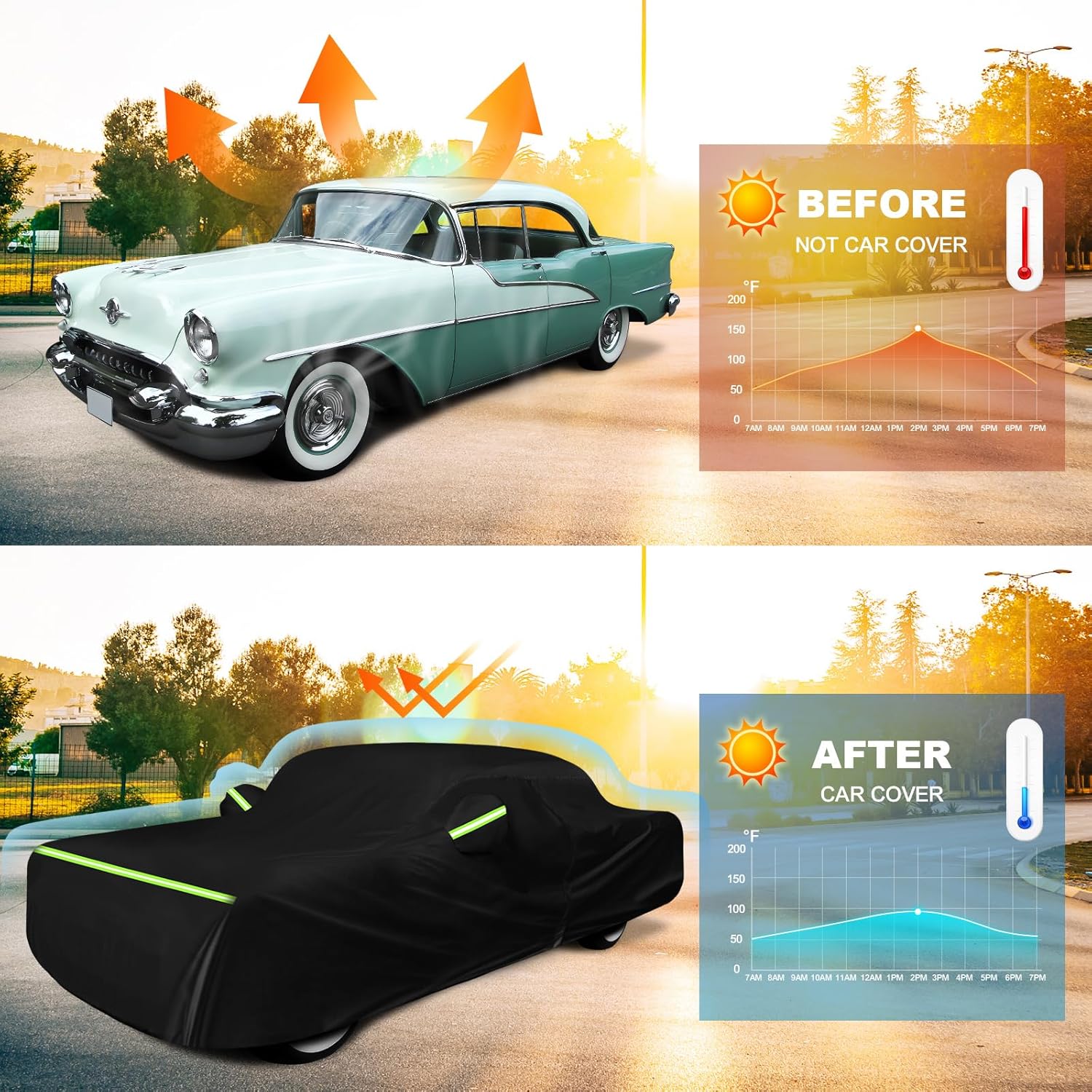 - 【All-Weather Protection】Made black 420D Oxford cloth and multi-layer waterproof fabric as material, ensuring its quality is tough, durable, and safe in strong wind conditions. Protects your vehicle and paint from rain, snow, sun, bird droppings, pollen, dust/dirt - suitable for all seasons.