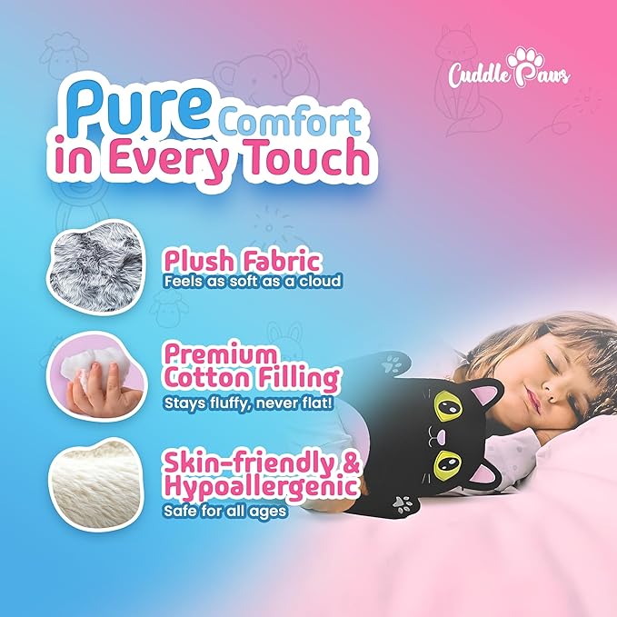 - Soft & Huggable Plush Pillow - The Cuddle Paws Black Cat Plush Pillow offers the perfect balance of softness and charm.Soft plush fabric filled with polyester, it provides a cozy and skin-friendly snuggling experience. Designed for kids, teens, and plush lovers, this pillow doubles as both a huggable companion and a supportive body pillow. Whether for bedtime, lounging, or relaxation, it retains its softness and shape over time, making it a must-have for comfort and warmth.