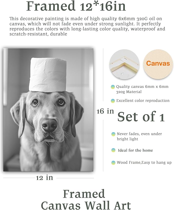 UPWOIGH Bathroom Wall Art Decor, Black and White Labrador Retriever Dog Toilet Paper Wall Art, Wood Framed Canvas Wall Art Animals Abstract Prints, 12"x16" High-end Pictures for Dormitory Kids Room