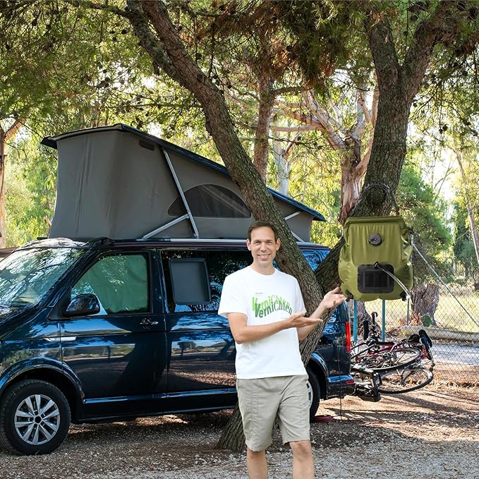 - Large capacity beautiful design : Our portable solar shower camping shower bags are designedwith high quality mesh stripes This camping shower bag has a capacity of 5 gallons, Heavyenough water to provide you with bathing and washing useand anywhere,don't be afraid ofcatching cold