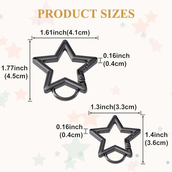 - Package Contains: You will receive 4 pcs zinc alloy star shaped carabiner in total. It contains 2 sizes: big and small. The bigger size is 1.61 x 1.77 in (4.1 x 4.5 cm), the smaller size is 1.3 x 1.4 in (3.3 x 3.6 cm), and the thickness is 0.16 in (0.4 cm). These 2 styles are enough for your daily use