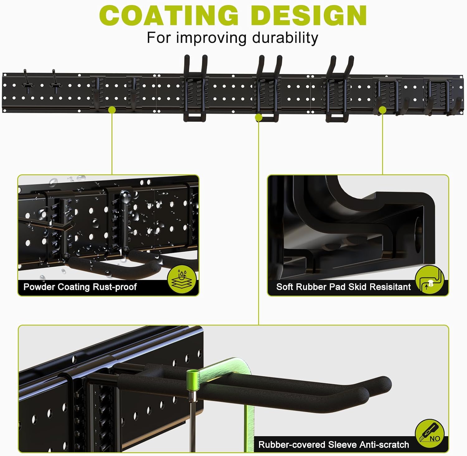 - Adaptable Storage System: Versatile tool racks for garage walls come with 9 hooks of varying sizes, perfect for accommodating all types of tools—from garden essentials to brooms and hoses. Effortlessly customize your storage for any project, ensuring every item is easily accessible