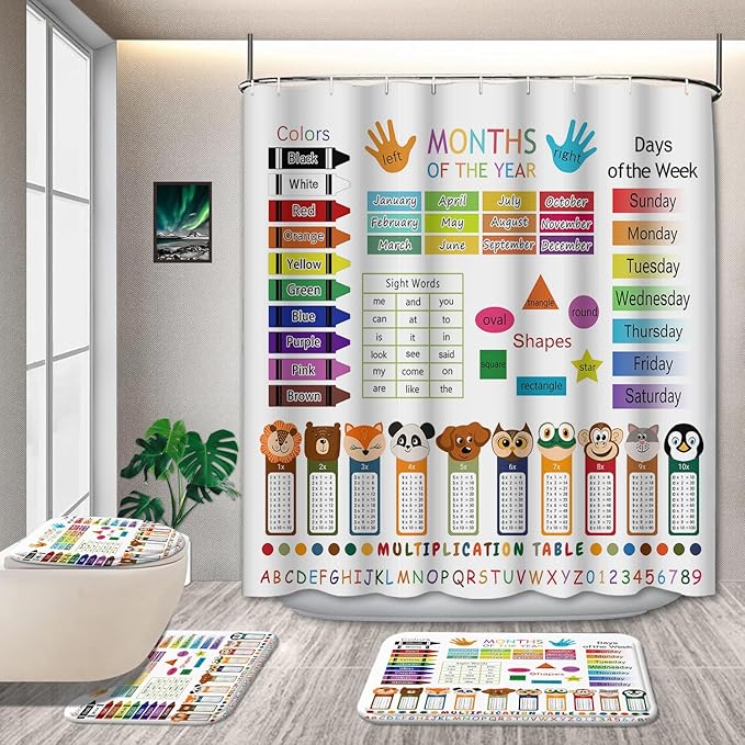 - All-in-One Educational Design – This kids’ shower curtain set features bright, engaging visuals of colors, months, days of the week, shapes, sight words, and a multiplication table to make learning fun and interactive.
