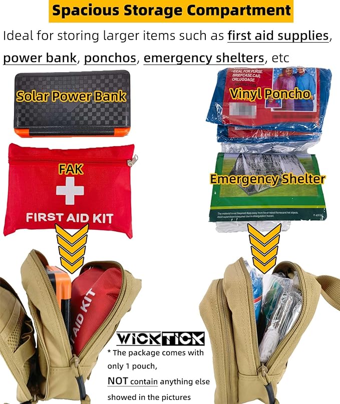 - This tactical EDC tool pouch features 2 distinct compartments: 1). **Multi-Slot Tool Organizer Compartment**: Designed for organizing small tools and accessories. 2). **Spacious Storage Compartment**: Ideal for storing larger items such as first aid kit supplies, ponchos, emergency shelters, or other essential gear