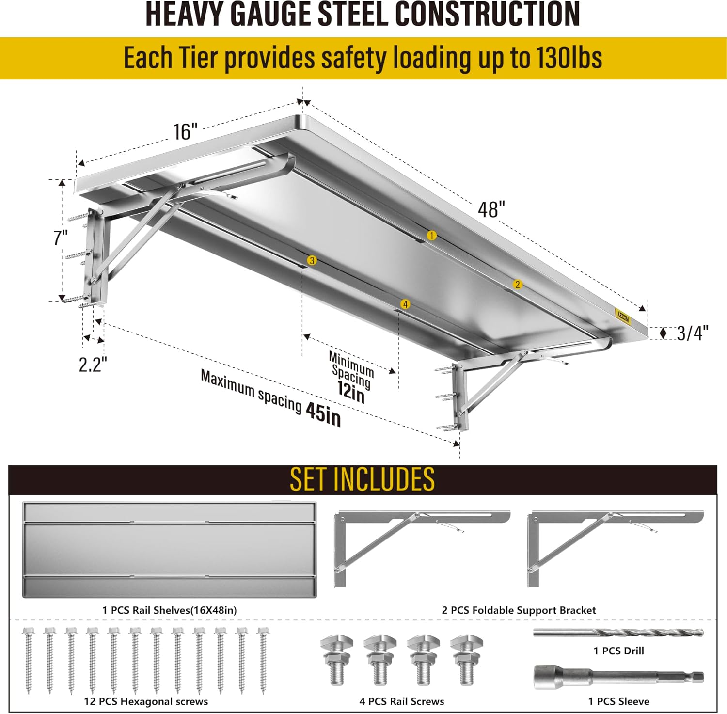 1.3x4ft Adjustable Rail Type Folding Storage Rack Shelf, Suitable for Garage, Storage Room, Kitchens Wall Shelf,Garage Storage Rack Floating Shelves, Wall Mounted Folding Table(1pc-Silver Gray)