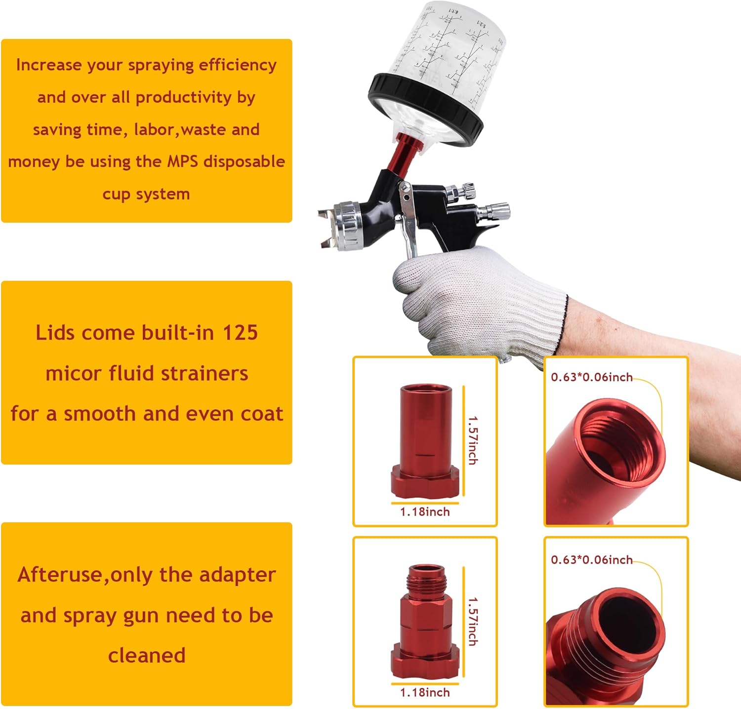 - 【Paint Cup Kit】: Includes 20 paint cup liners, 20 lids with built-in 125-micron liquid filters, 5 sealing plugs, 2 spray gun adapters (16mm internal threads, 1.5mm threads and 16mm external threads, 1.5mm threads), 1 hard cup with a securing ring, 1 sealing ring, and 1 stirrer. The paint cup liners are ideal for automotive coatings, clear coats, resins, dyes, and sealants.
