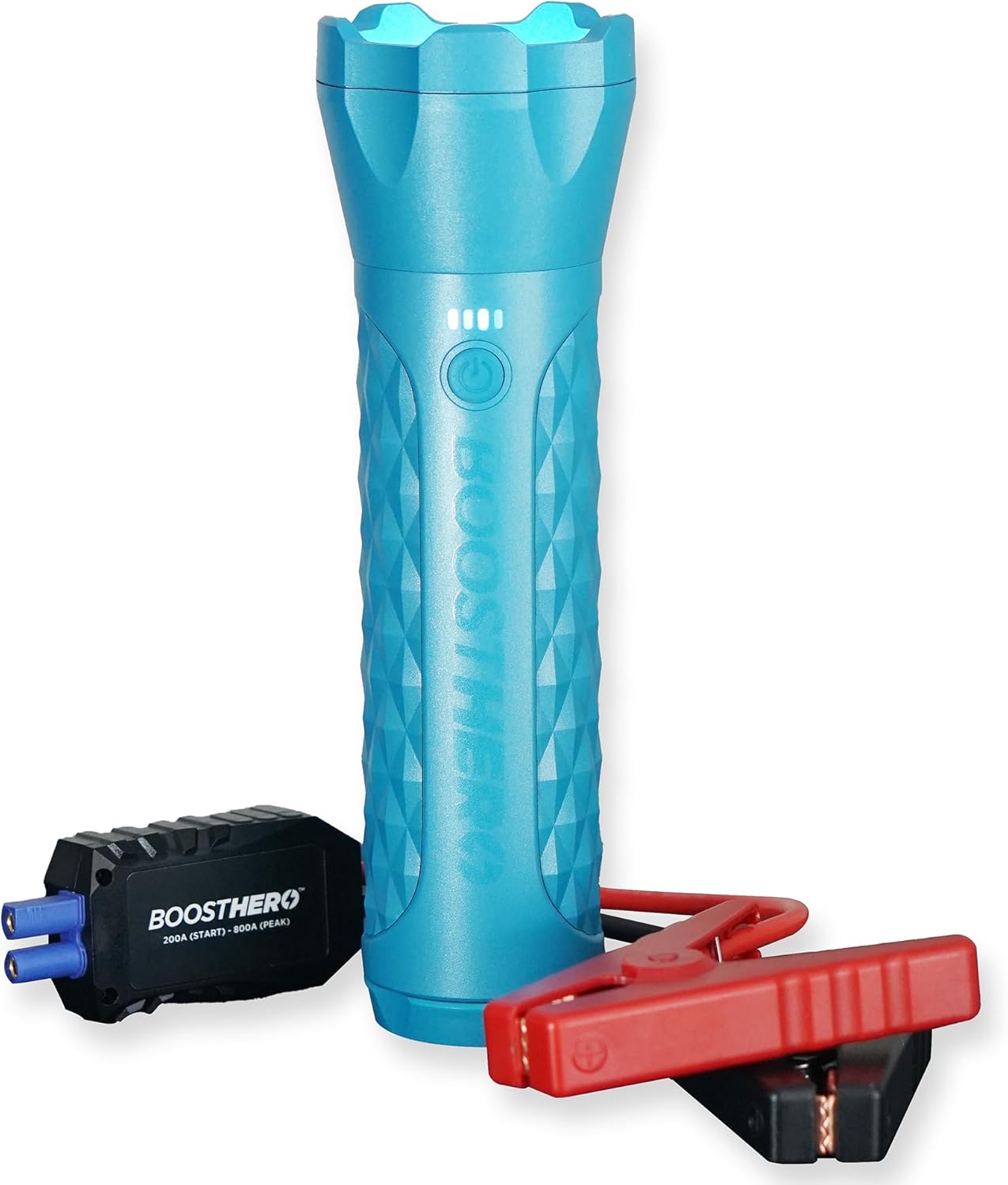 - Universal Jump Starter - The BoostHero is powerful enough to jump start most cars, trucks, SUV’s, boats, motorcycles, lawn mowers, ATV’s, and more! Instantly jump a drained vehicle battery by clamping the Smart Jumper Cables with the patent-pending mini flashlight directly onto the vehicle battery terminals. Powerful 800A peak current to jump-start vehicles with up to 6.0L gas or 4.0L diesel engines.