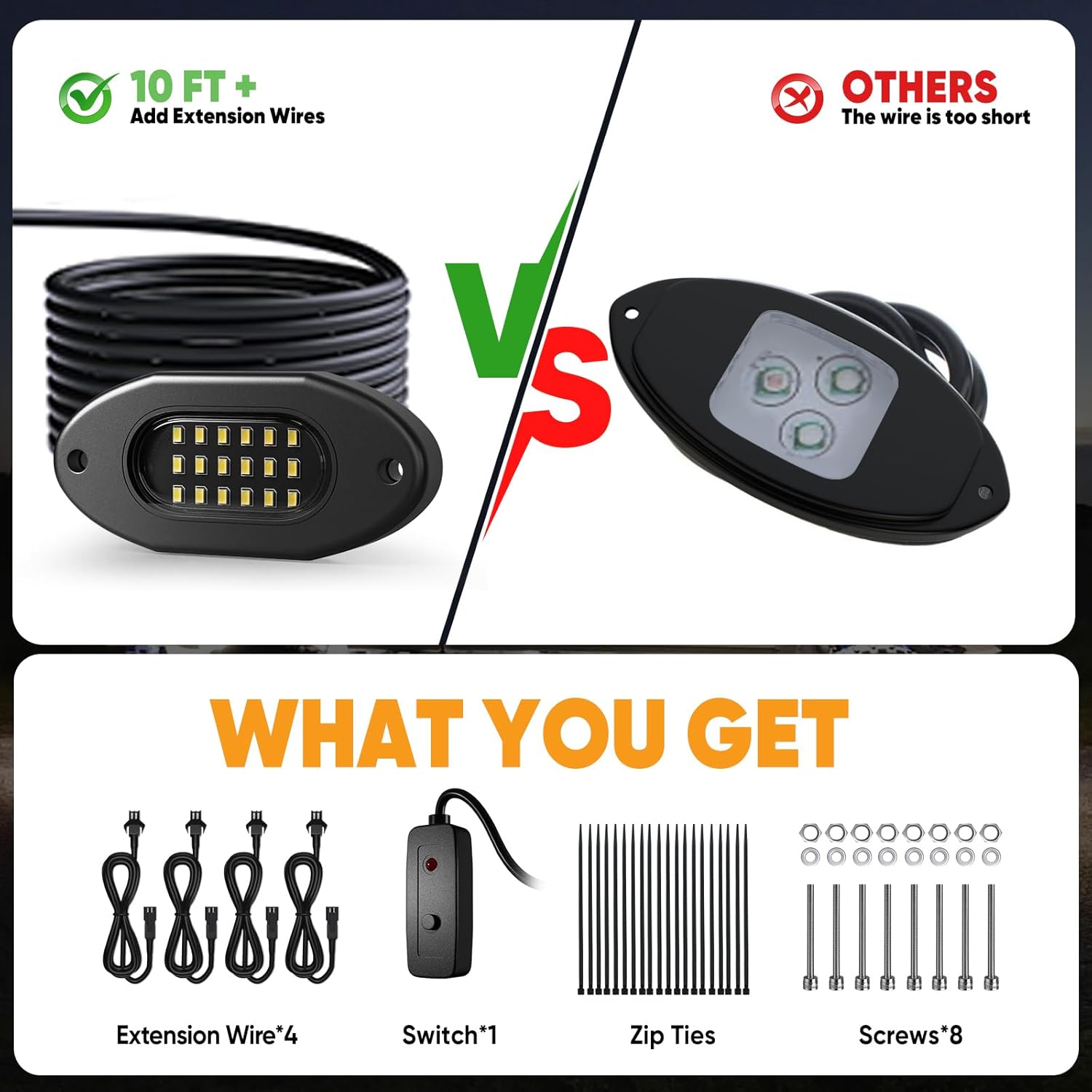 - 【Versatile Application】Honalia pure white led rock lights kits are perfect for enhancing your vehicle's appearance in various settings. Improve safety on the road with Honalia Pure White Rock Lights Kits. Illuminate your journey