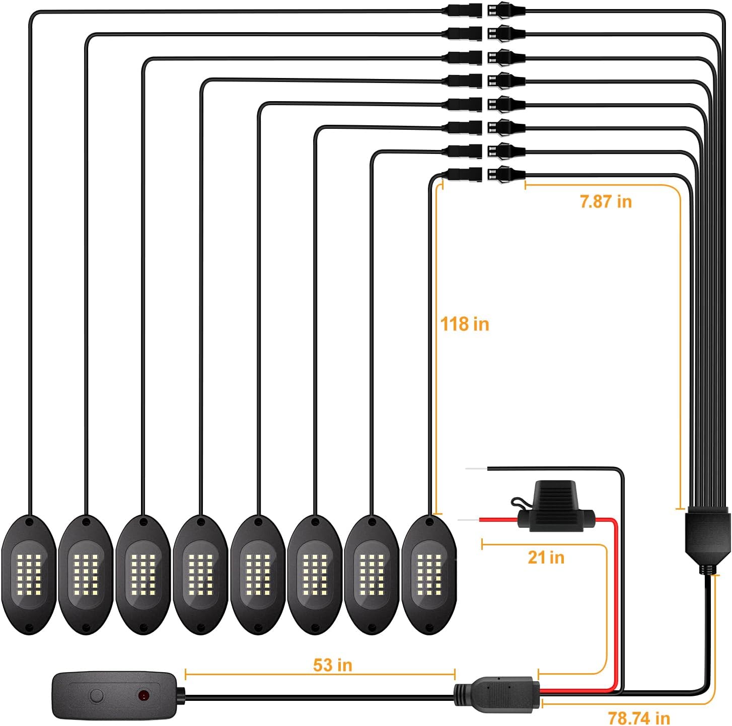 - 【Each Pod Wired is 118 inches】Each pod comes with a cable length of 118 inches. IIf you want to decorate a large vehicle, you may need to add additional extension cords. Please search for ASIN: B0DLSL74CC on Amazon to add more, this extension wire is plug and play, specifically compatible with Honalia white rock lights for trucks