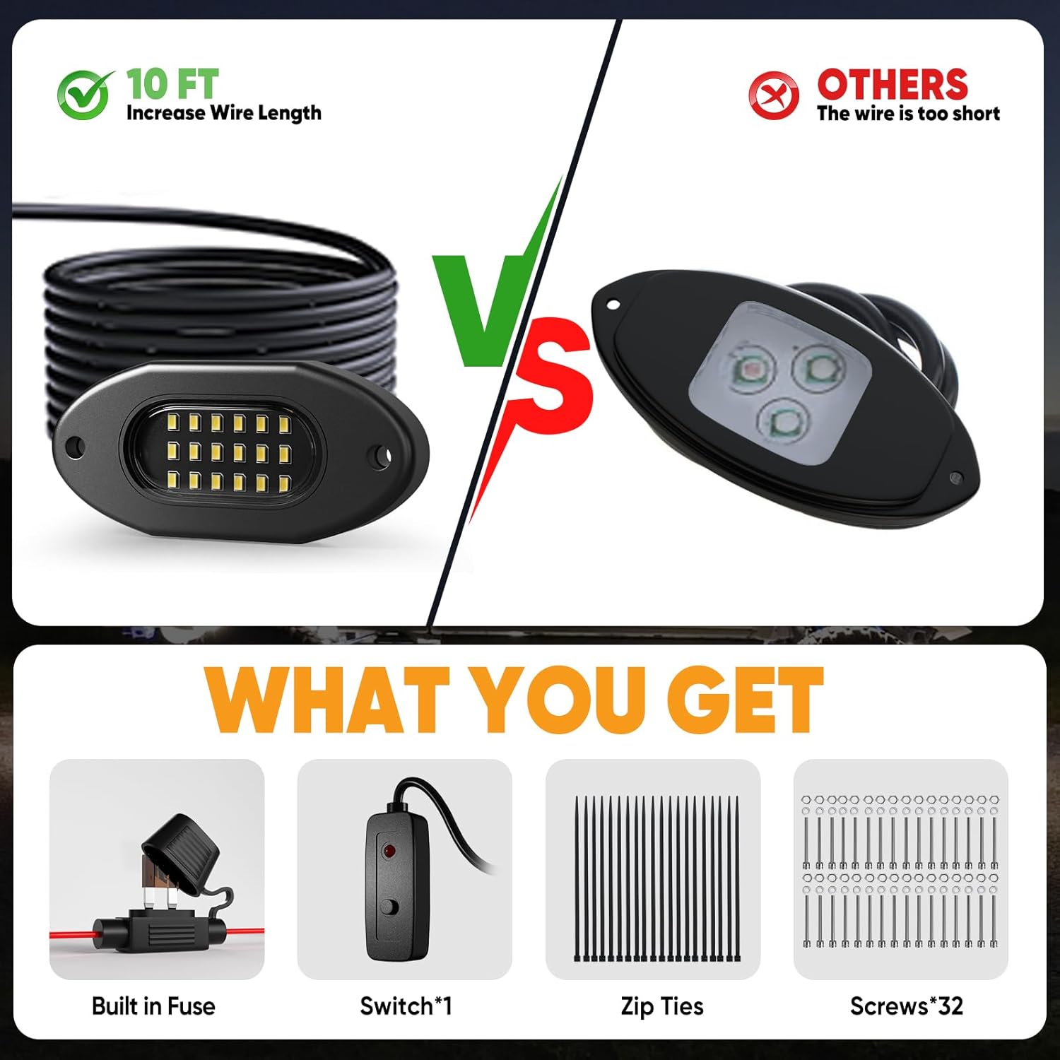 - 【Versatile Application】Ideal for trucks, SUVs, UTV, ATV, RZR, Golf Cart, and other vehicles, these led rock lights white are perfect for enhancing your vehicle's appearance in various settings, from adventures to nighttime gatherings. Improve safety on the road with Honalia Pure White Rock Lights Kits. Illuminate your journey