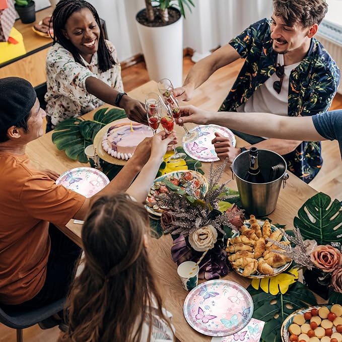 - 【Convenience & Clean-Up】These butterfly-themed party sets are the perfect addition to your holiday party decorations. One of the main benefits of using disposable paper plates is the convenience they offer. There’s no need to worry about washing dishes or dealing with a pile of dirty tableware. Simply gather the plates and dispose of them. After the party, you can spend more time with your family or friends and less time cleaning up.