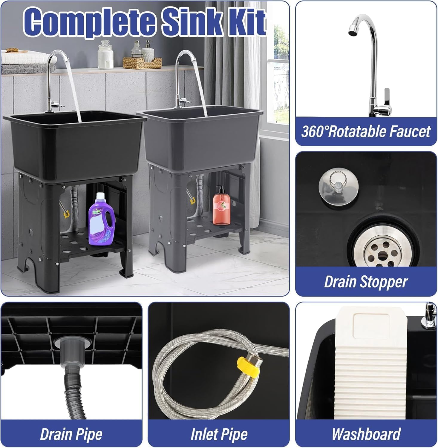 - Complete Set: This complete laundry tub kit includes a sink, a faucet, a drain pipe, a water inlet hose, a washboard, and a complete line of accessories, so you don't have to buy them separately, making this utility tub more economical and convenient, you can easily complete the installation in a short time