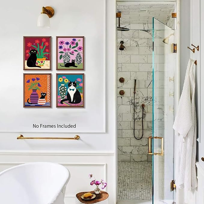 - Vibrant Wall Art: Set of 4 unframed 8x10 inch canvas posters featuring whimsical abstract floral and black cat designs in vivid colors