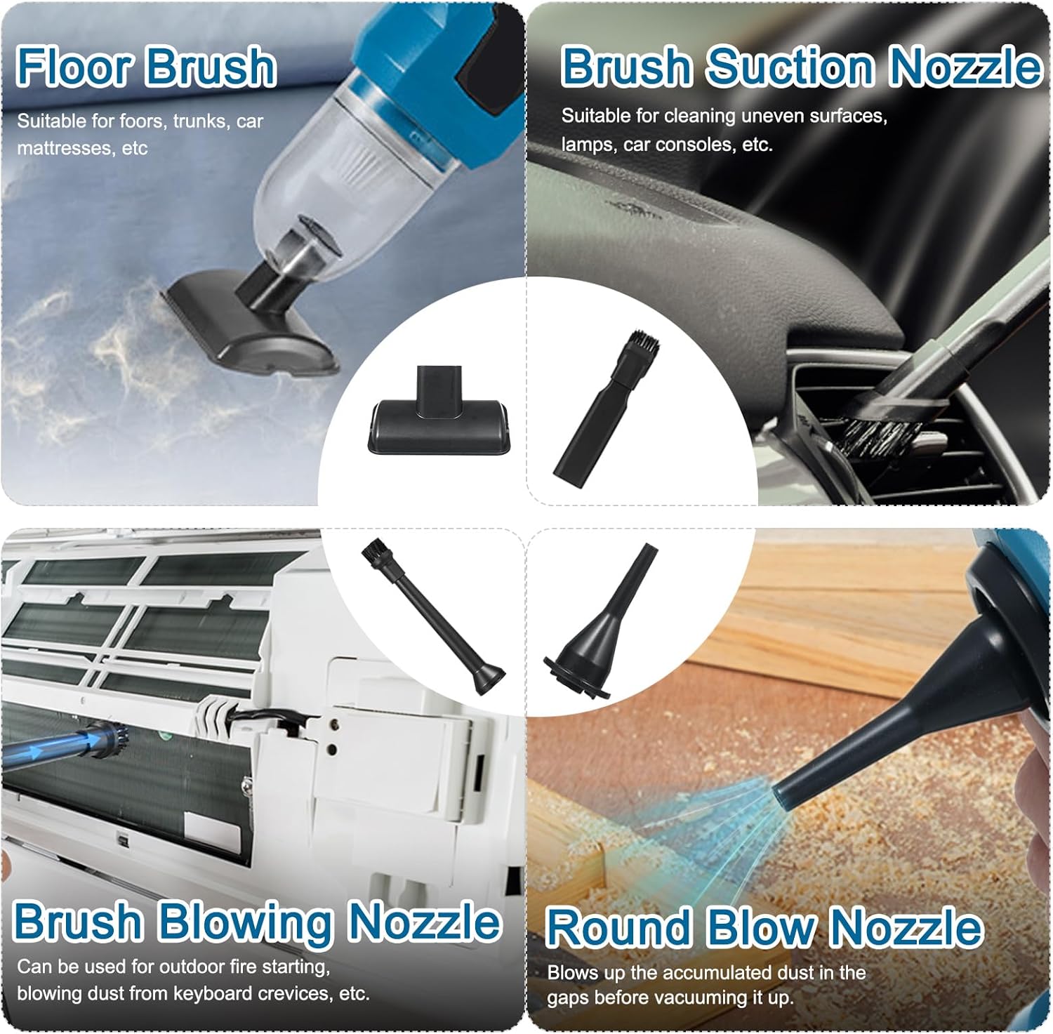 - 【Packing List】Car vacuum*1, Rechargeable battery*1, Filter*2, Charging cable*1, 1 * User Manual. [Vacuum Accessories]:Floor brush*1,Flat suction brush*1,Long flat suction*1,[Blowing and Inflating Accessories]:Short blowing nozzle*1,Pipe blowing round brush*1,Long blowing pipe*1, Inozzle*1.