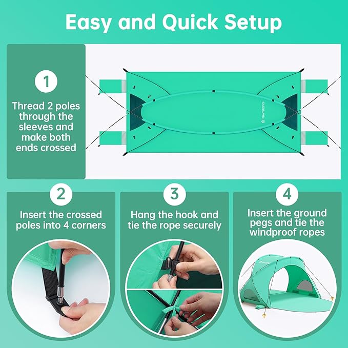 - Solid Structure & Windproof: Our beach shelter is equipped with 2 thickened fiberglass poles, 4 sandbags, 4 windproof ropes, and 12 ground pegs for an enhanced grip. The unique cross-support design improves the stability of the tent, which can resist strong winds, prevent collapse, and make your outdoor trip safer and more relaxing.