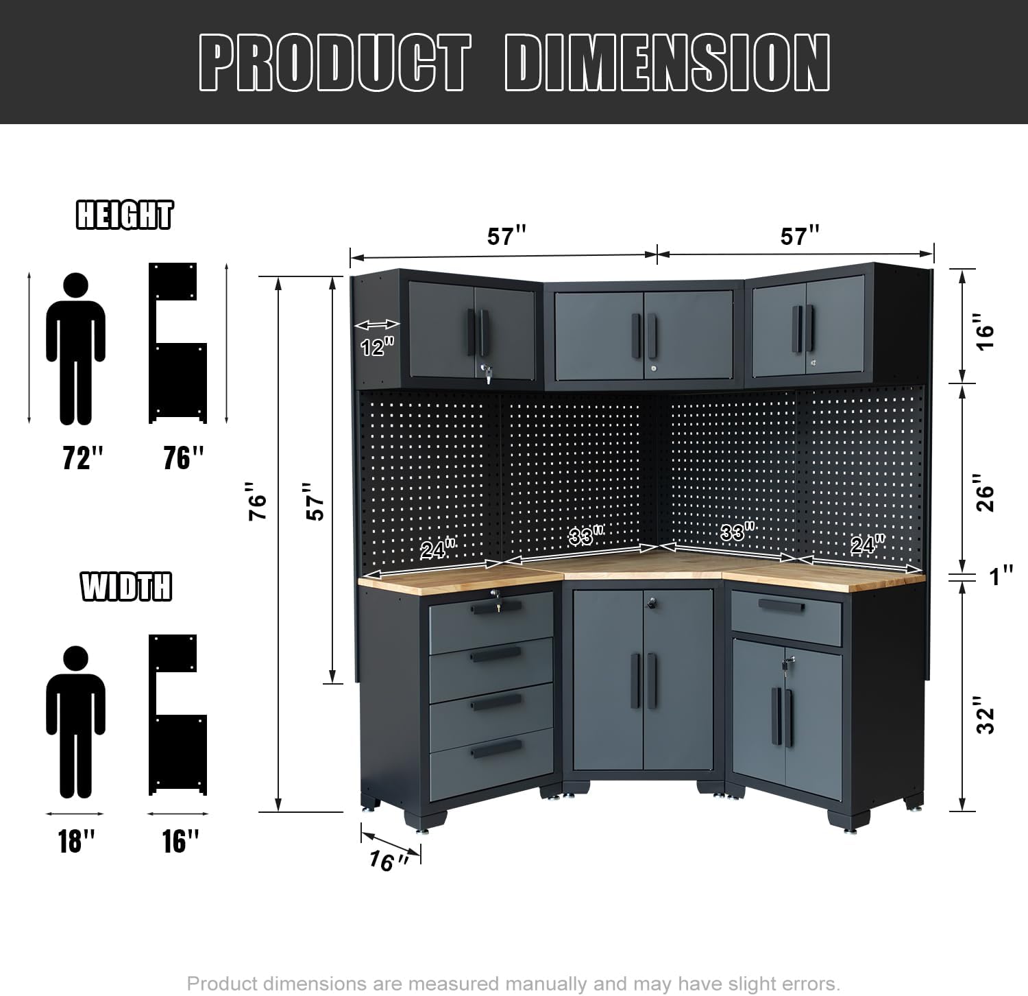 Garage Storage Cabinet System - 8-Piece Set with Corner Cabinet, Drawers, Workbench, Pegboard for Tool Organization - Black and Grey