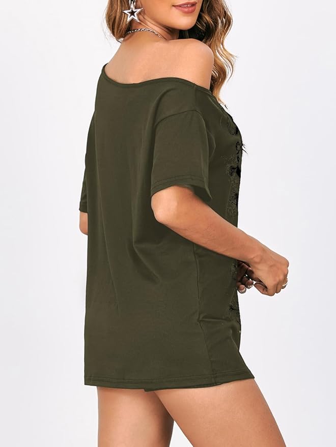 - Womens going out tshirt, graphic print, asymmetrical neck, short sleeve, drop shoulder, loose fit, making you look stylish and casual
