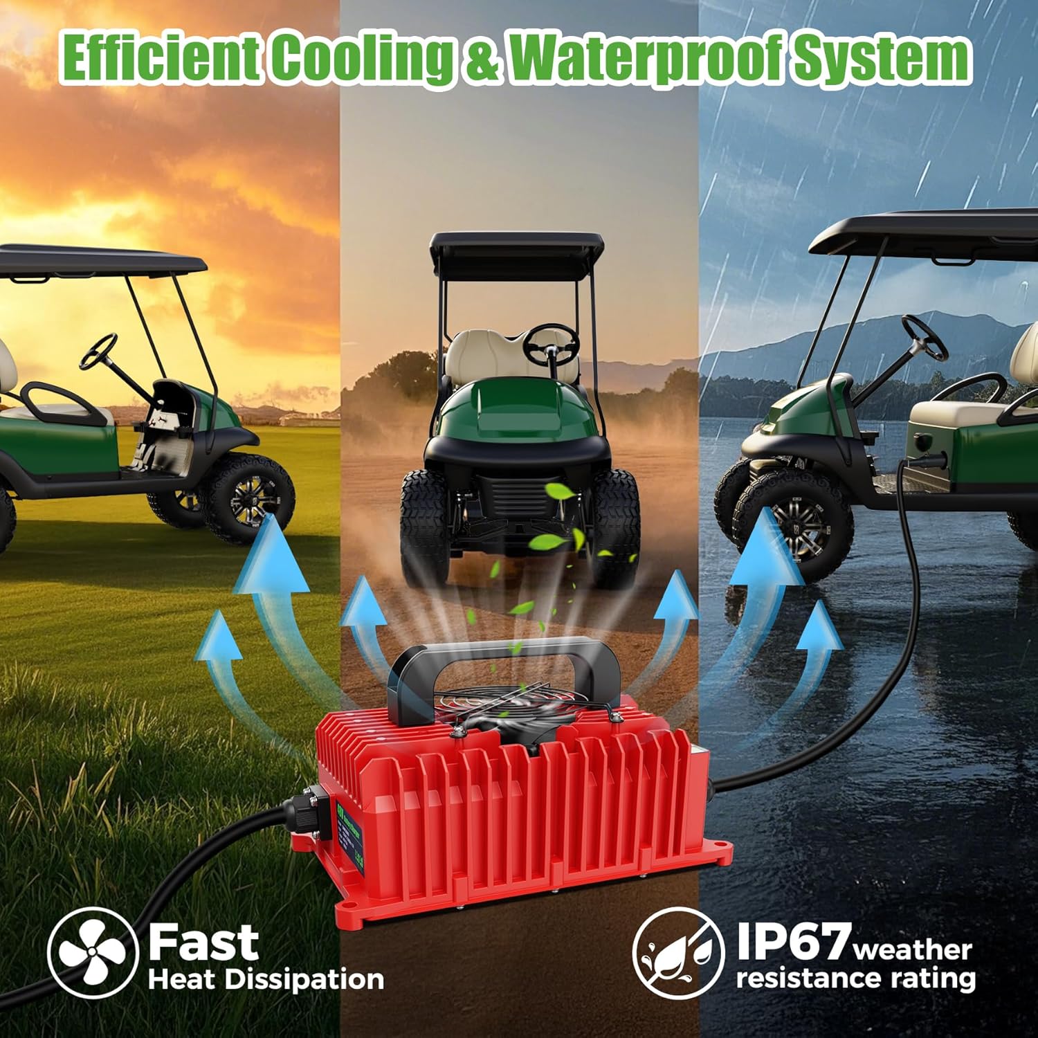 - Efficient Cooling & Waterproof System: Our golf cart charger built with an aluminum casing and powerful cooling fans, preventing overheating during charging, With an IP67 weather resistance rating, you don't have to worry about your charger being damaged by water, dust or vibration.